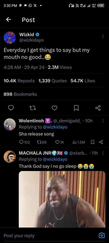 The Jaiye Jaiye crooner who hardly tweets, but has a penchant for posting controversial tweets set X on fire when he tweeted, “Every day I get things to say but my mouth no good”, exactly 4:28 am on Monday, to which a fan who tweets as @demigadd responded, “Sha release song”, prompting Wizkid to respond with “Na by force.”