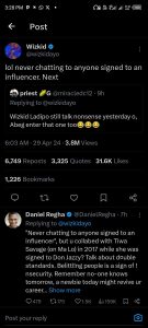 Like he was out for his fellow music stars, the ‘Ojuelegba’ hit singer responded at 6:03 with an innuendo describing Don Jazzy as an influencer. He wrote, “Lol, never chatting to anyone signed to an influencer. Next.”