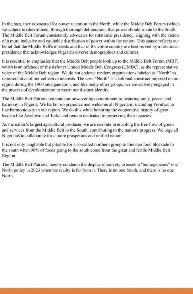 Patrick also touched on the complexity of Nigeria as a country quipping. “The Middle Belt Patriots hereby condemn the display of naivety to assert a “homogeneous” one-North policy in 2023 when the reality is far from it. There is no one South, and there is no one North.” The monolithic North encompassing Yorùbá people of Kwara and Middle Belt people in the Savannah areas is long gone, and nobody should falsely annex us to any colonial identity.
