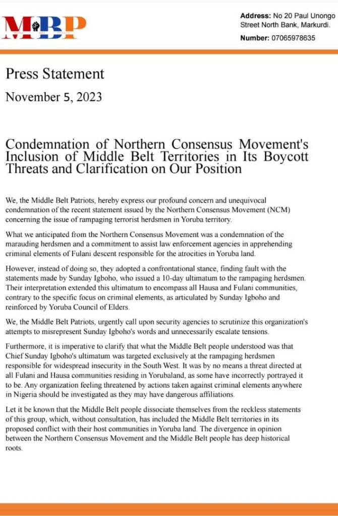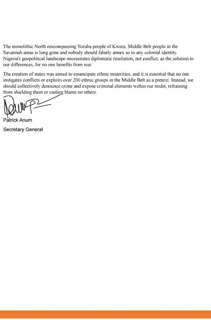 “Let it be known that the Middle Belt people dissociate themselves from the reckless statements of this group, which, without consultation, has included the Middle Belt territories in its proposed conflict with their host communities in Yorùbá land.