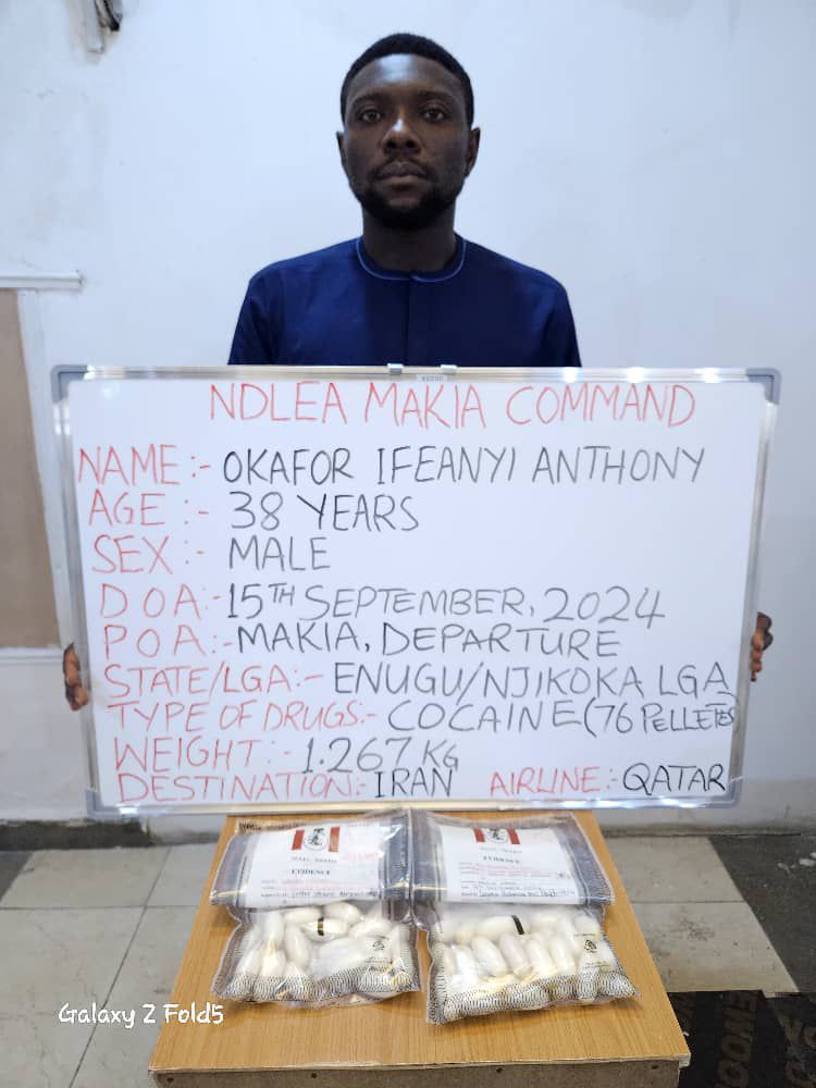 The statement reads, βAt the Mallam Aminu Kano International Airport (MAKIA), Kano, NDLEA operatives on Sunday 15th September arrested a 38-year-old drug mule, Okafor Ifeanyi Anthony while attempting to board a Qatar Airlines flight to Iran via Doha with 76 wraps of cocaine in his stomach.