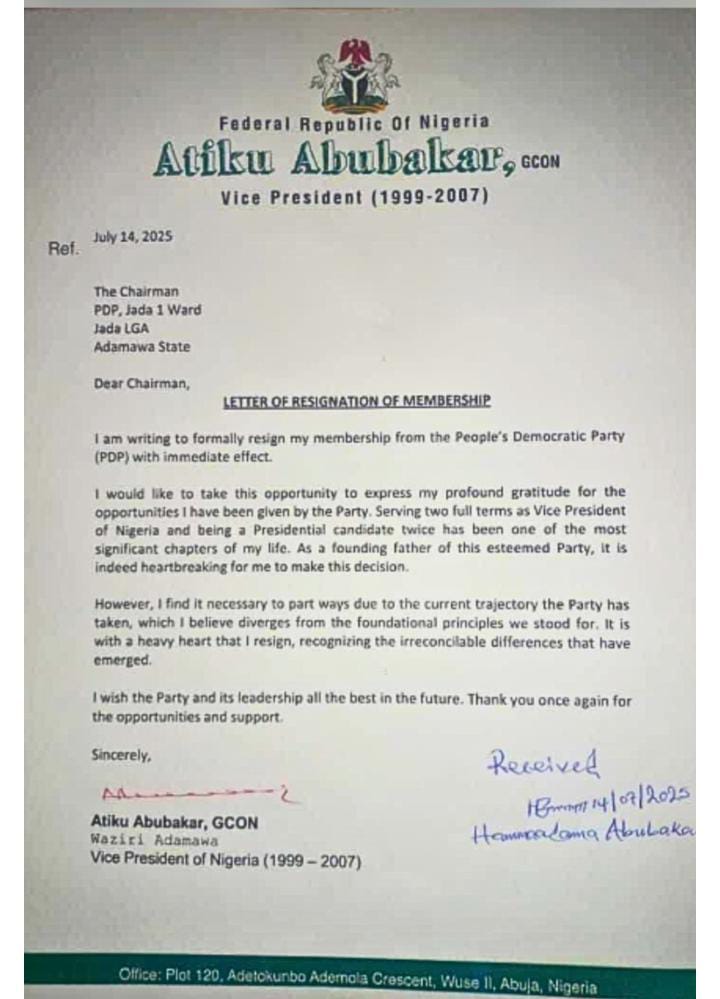 This was contained in a letter dated July 14, 2025, addressed to the PDP Chairman of Jada 1 Ward, Jada Local Government Area in Adamawa State, Atiku explained his decision to resign.
