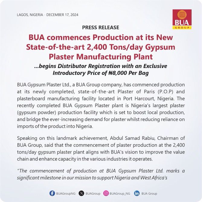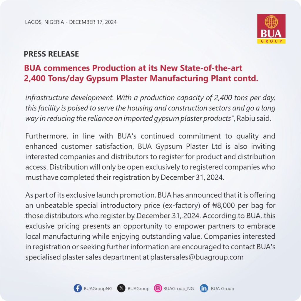 According to BUA Group, the new facility will provide high-quality gypsum products to the Nigerian market, supporting the country’s construction and building industry.