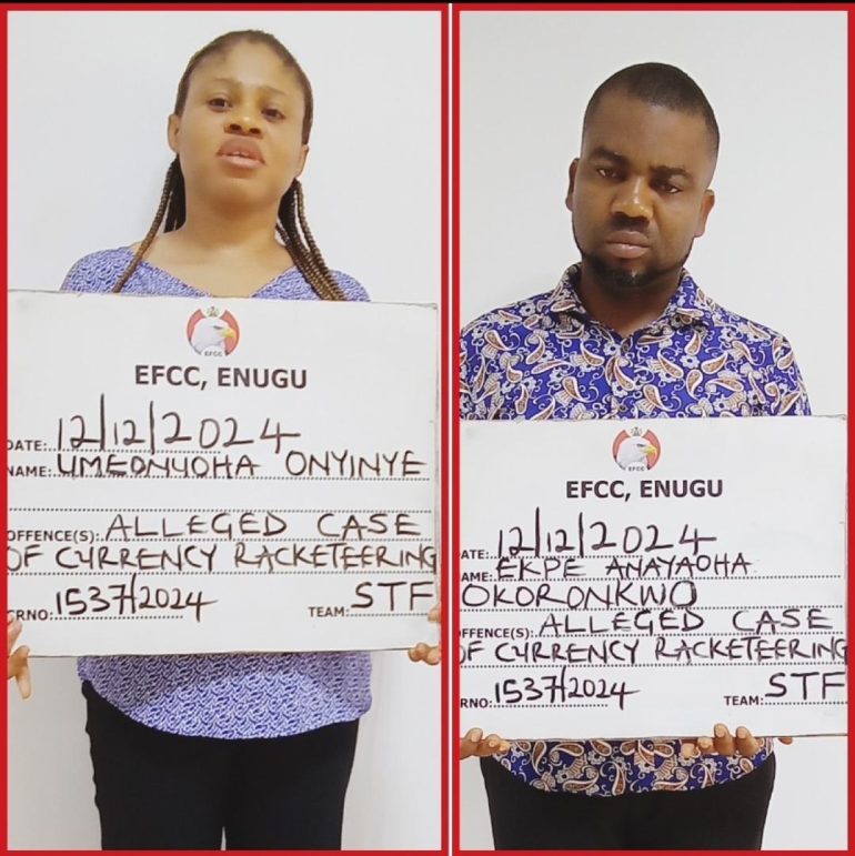 EFCC arraigns Ekpe Anayaoha Okoronkwo and Umeonuoha Onyinye for alleged currency racketeering in Enugu