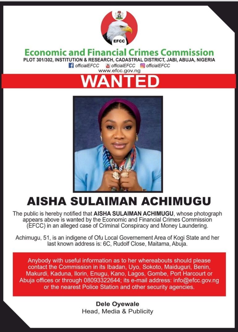 “The public is hereby notified that Aisha Sulaiman Achimugu, whose photograph appears above is wanted by the Economic and Financial Crimes Commission (EFCC) in an alleged case of criminal conspiracy and money laundering,” the circular reads.