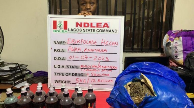 Meanwhile, a Lekki Lagos based female lawyer, Ebikpolade Helen, who specialises in production and distribution of skuchies, a mixture of cannabis, opioids and black currant has been arrested in a follow up operation in Awka, Anambra state following an earlier seizure of 5 kilogrammes cannabis and 12 bottles of prepared skuchies in her apartment at Lekki.