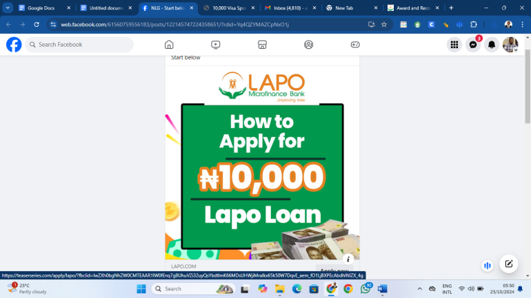 On October 14, 2024, a Facebook page with the username NLG, posted promotion content on its wall that LAPO Microfinance Bank is giving loan to the members of the public, urging them to apply as instantly as possible.