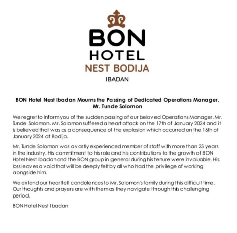The BON Hotel Nest, Ibadan, is mourning the loss of their dedicated Operations Manager, Tunde Solomon, who died of heart attack on the 17th of January 2024.