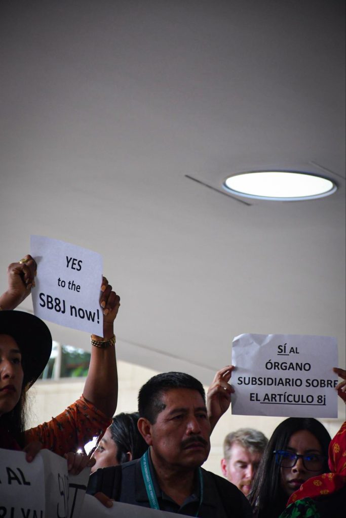 The International Indigenous Forum on Biodiversity (IIFB) mobilized supporters to gather outside the Sierra Nevada room, holding placards advocating for the creation of a subsidiary body under Article 8(j).