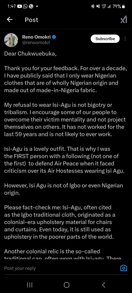 Reno Omokri has responded to criticism on social media regarding his stance on wearing Isi-Agu, a traditional attire often associated with the Igbo culture.