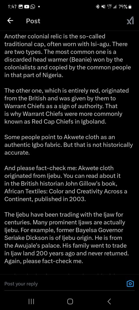 Omokri went on to explain that Isi-Agu, often cited as a traditional Igbo cloth, actually has its origins in colonial-era upholstery material.