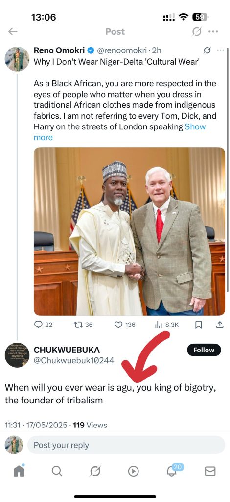 A user named Chukwuebuka had taken to X (formerly Twitter) to express his disapproval, calling Omokri the “king of bigotry” and “father of tribalism” for his reluctance to wear the outfit.