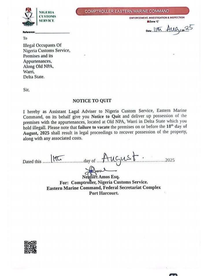 The petition, filed through the law firm of ADEROJOR OLOGHOJOBA & CO, Abuja, was addressed to the Comptroller-General of Customs, Mr. Bashir Adewale Adeniyi; the Comptroller of NCS, Mr. Dim Chika; the Warri South Local Government Chairman, Hon. Agbateyinero Isaac Weyimi; and the Chairman of the Itsekiri Leaders of Thought (ILOT), Chief Edward Ekpoko.