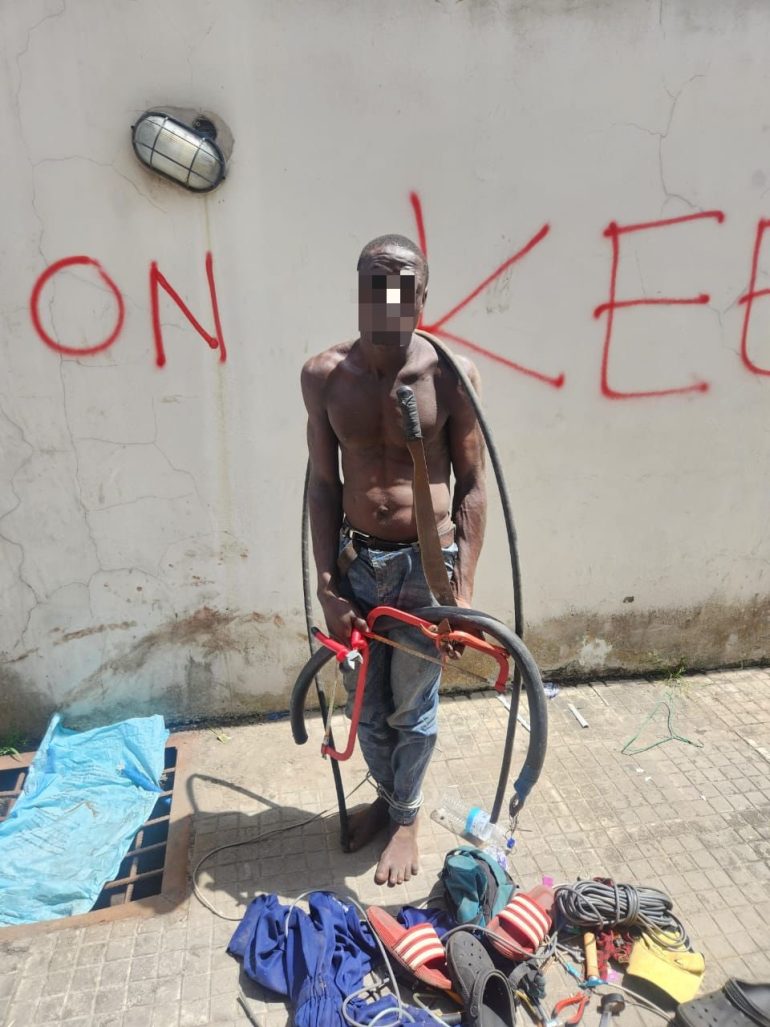 He wrote, “Following a distress call, officers of Onikan Division have arrested one Abubakar Haruna, aged 27, after he jumped into a compound, and cut off cables from the transformer within the premises.