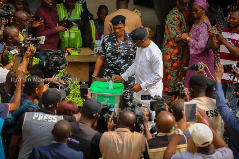 The Chief of Staff to the President, Femi Gbajabiamila on Saturday, cast his vote at Ward 08, Polling Unit 014, Mercy Eneli Street, Elizabeth Fower Primary School, Surulere Constituency l, in the on-going re-run election into the House of Representatives.