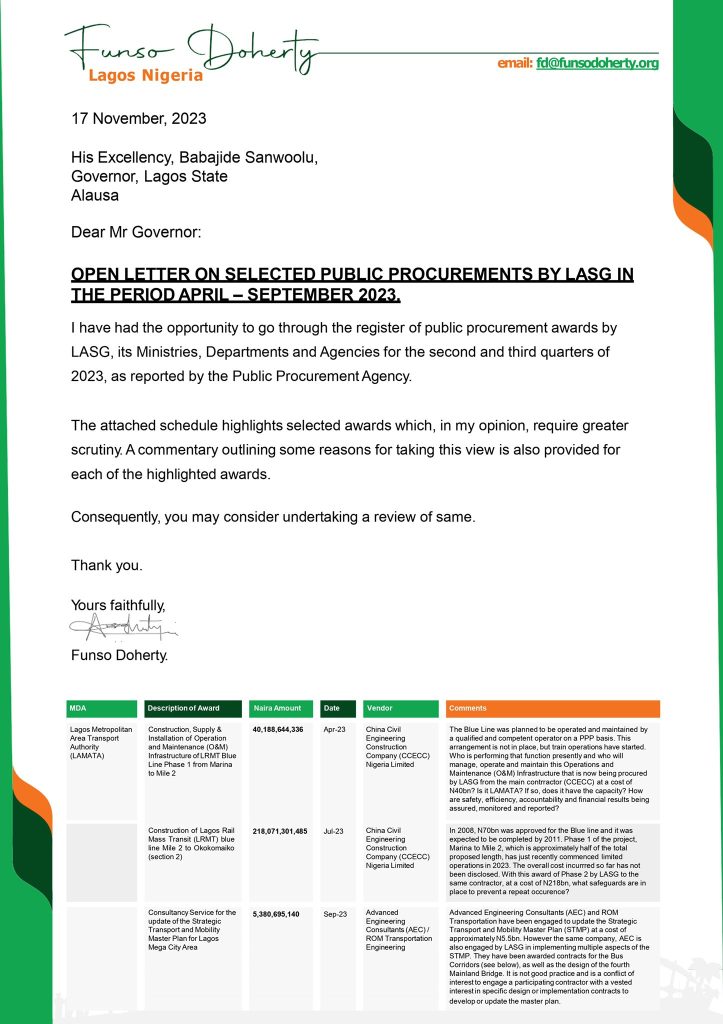 This was revealed in an open letter of public procurement addressed to Governor Babajide Sanwo-Olu, and signed by Doherty dated 17th November, 2023.