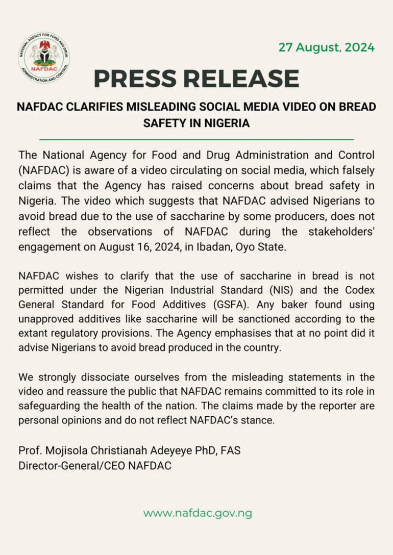 “NAFDAC dissociates herself from the comment of the reporter in the circulating video about avoiding bread in Nigeria.