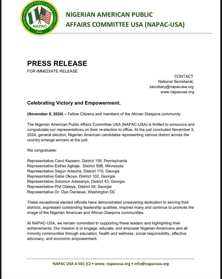 The group congratulates the seven Nigerian American candidates on their re-election in the November 5, 2024, General election.
