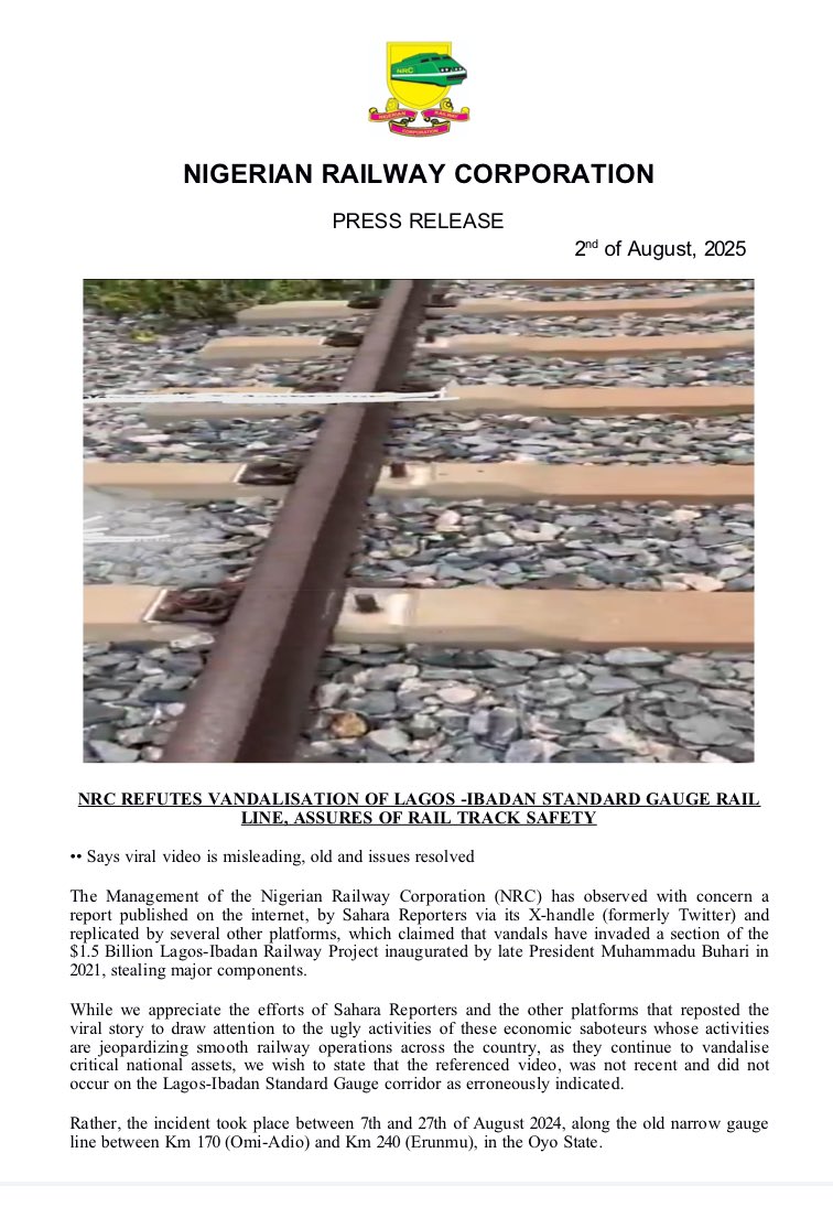 NRC reassured the public that robust security measures are in place to protect the rail infrastructure, and that regular maintenance and surveillance operations are being conducted along the Lagos-Ibadan corridor.