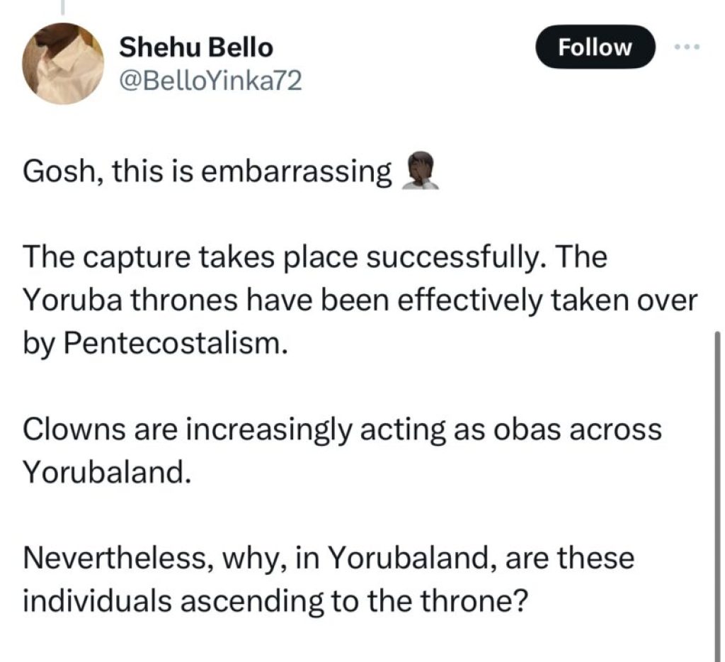 The viral picture of Oba Ghandi kneeling before Pastor Adeboye has generated mixed reactions on social media platforms, with some commending the display of humility and others expressing concerns about why a King should kneel before a man, asking questions about the intertwining of the Yoruba traditional system and religion.