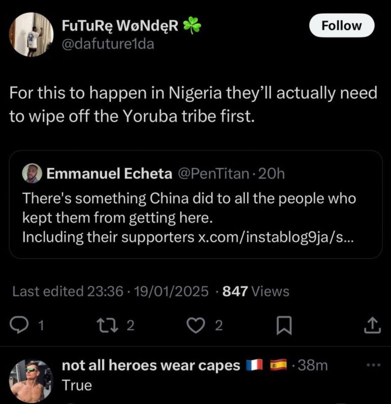 The social media user, who has since deleted their account, responded to the tweet by saying that for Nigeria to achieve similar unity, the Yoruba tribe would need to be “wiped off” first.
