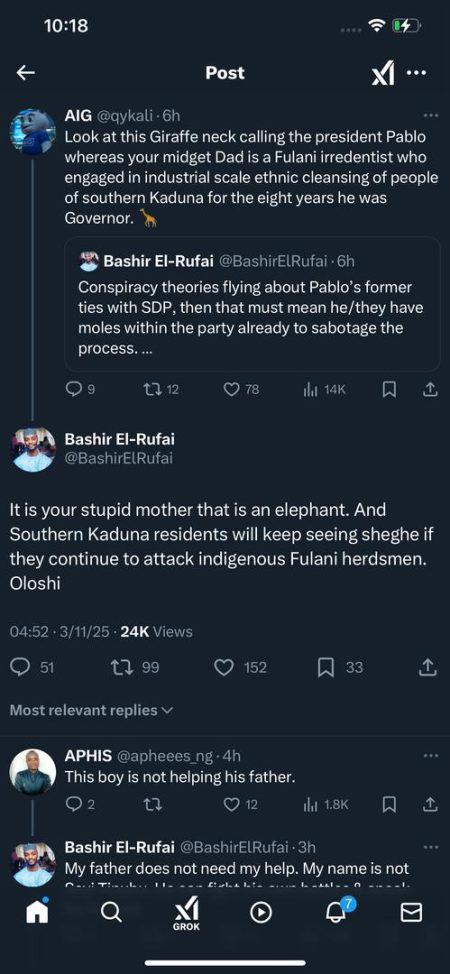 Bashir El-Rufai, son of former Kaduna State Governor, Nasir El-Rufai, has sparked outrage with his veiled threats against Southern Kaduna residents. In an online spat with X user AIG (@qykali), Bashir responded to a quoted post, saying: