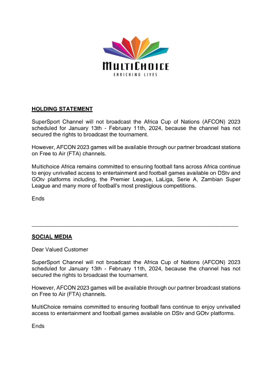 The statement reads: “SuperSport Channel will not broadcast the Africa Cup of Nations (AFCON) 2023 scheduled for January 13th – February 11th, 2-24, because the channel has not secured the rights to broadcast the tournament.