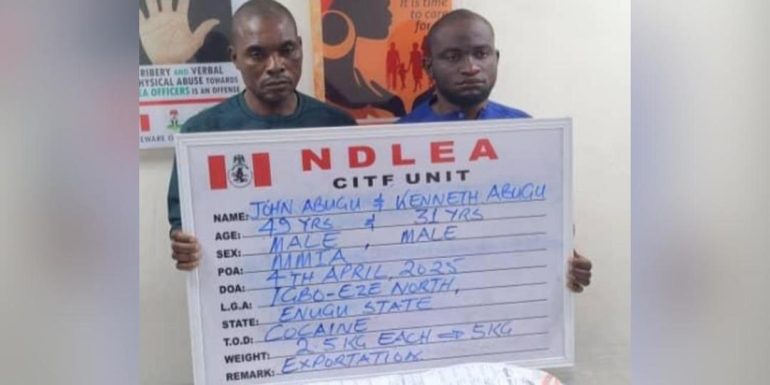 βThe two brothers were arrested at the Lagos airport on Thursday, April 3, 2025, following proactive processing of credible intelligence,” said Femi Babafemi, NDLEA Director of Media & Advocacy.